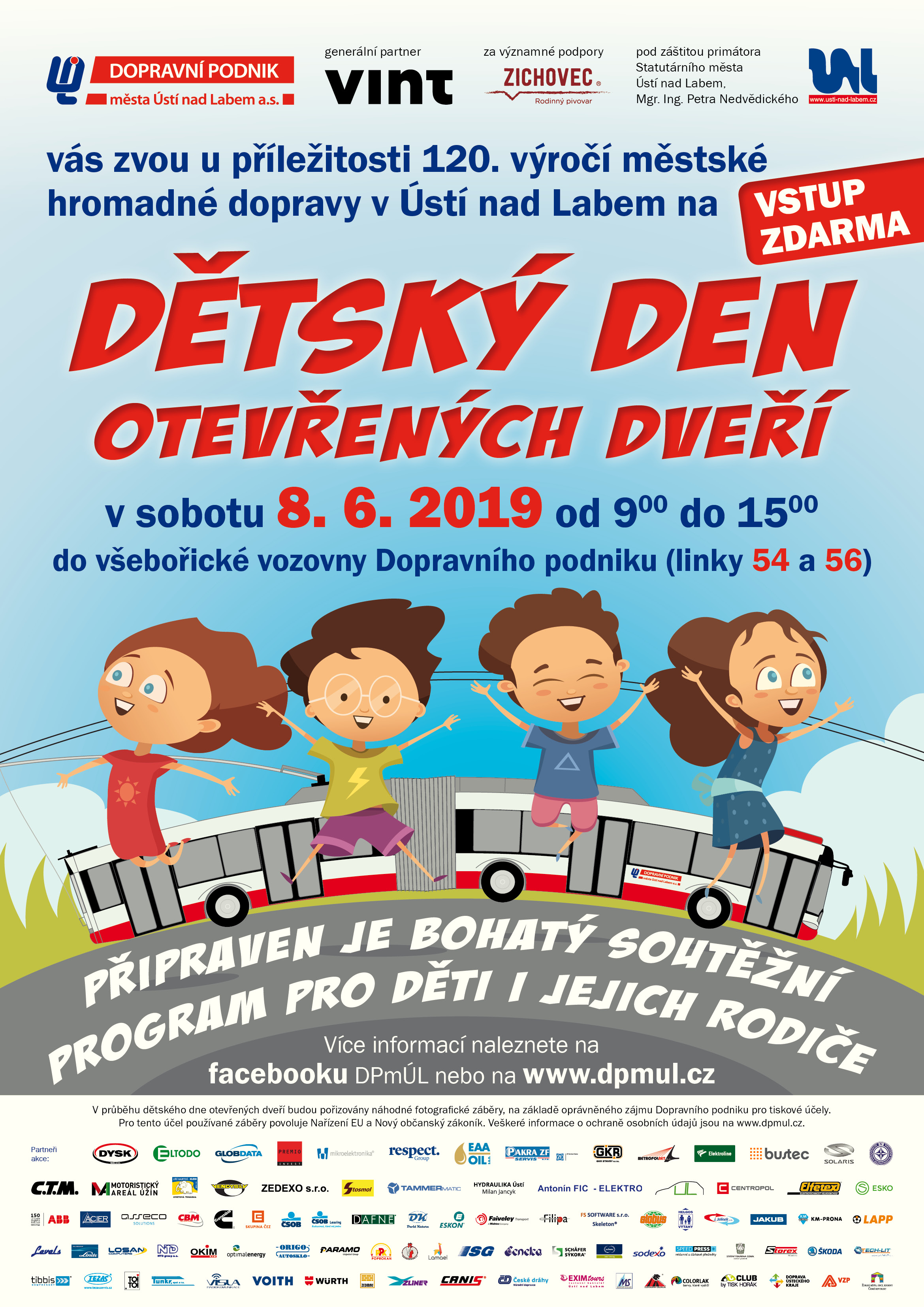 Dovolujeme si vás tímto srdečně pozvat na Dětský den otevřených dveří, který se uskuteční 8. červnau příležitosti oslav 120 let městské hromadné dopravy. Dětský den otevřených dveří se stává tradiční akcí, kterou pravidelně navštíví tisíce lidí. Je pořádán ve spolupráci se statutárním městem Ústí nad Labem. Brány vozovny se otevřou v 9 hodin. Na akci nebude chybět ani informační stánek VZP.